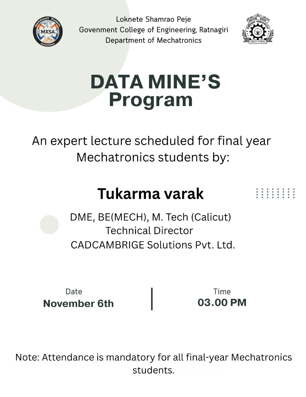 6 November 2025Guest Lecture On data Mine'sA vibrant exchange of ideas during the annual Debate Competition with 10 teams from SY and TY Mechatronics. read more |
